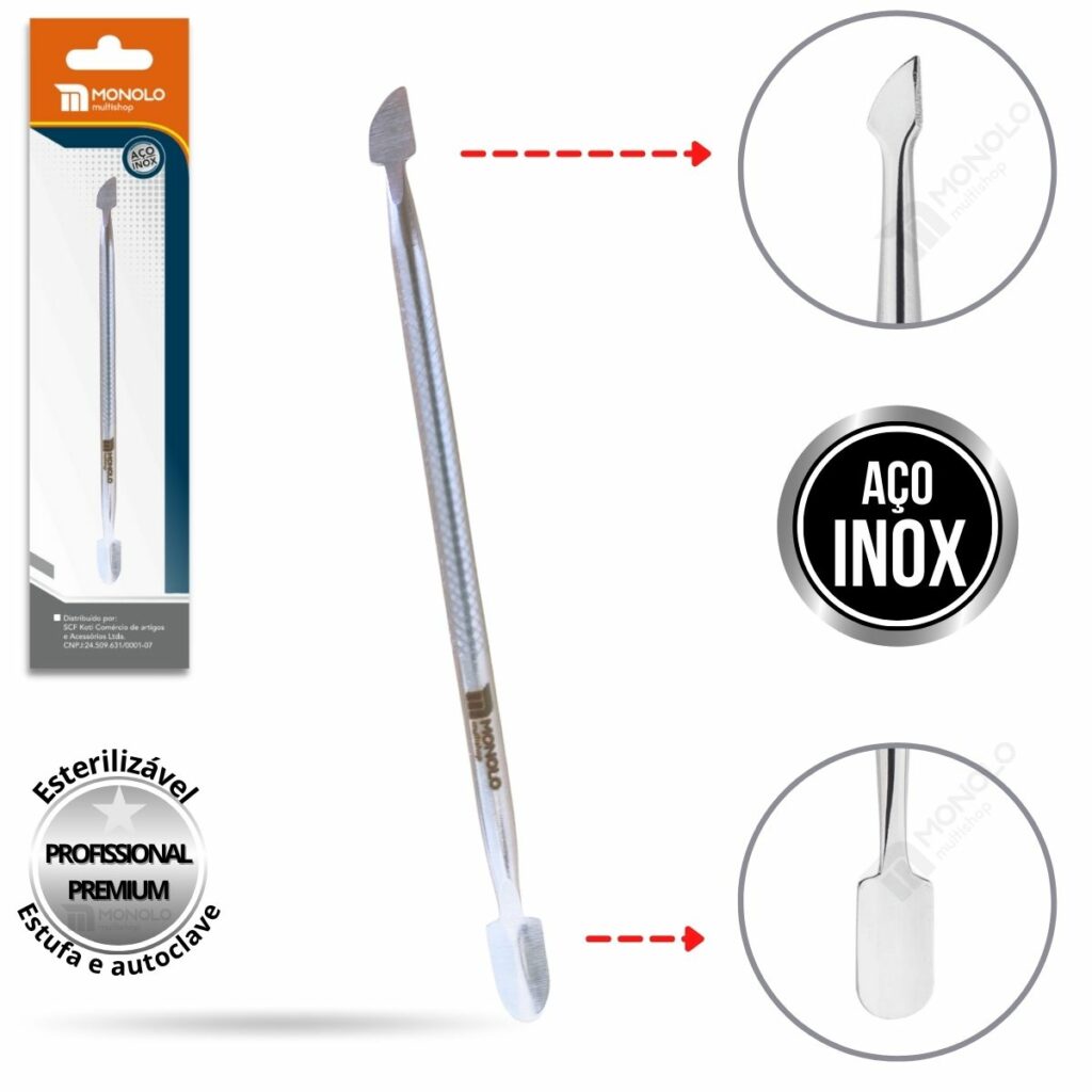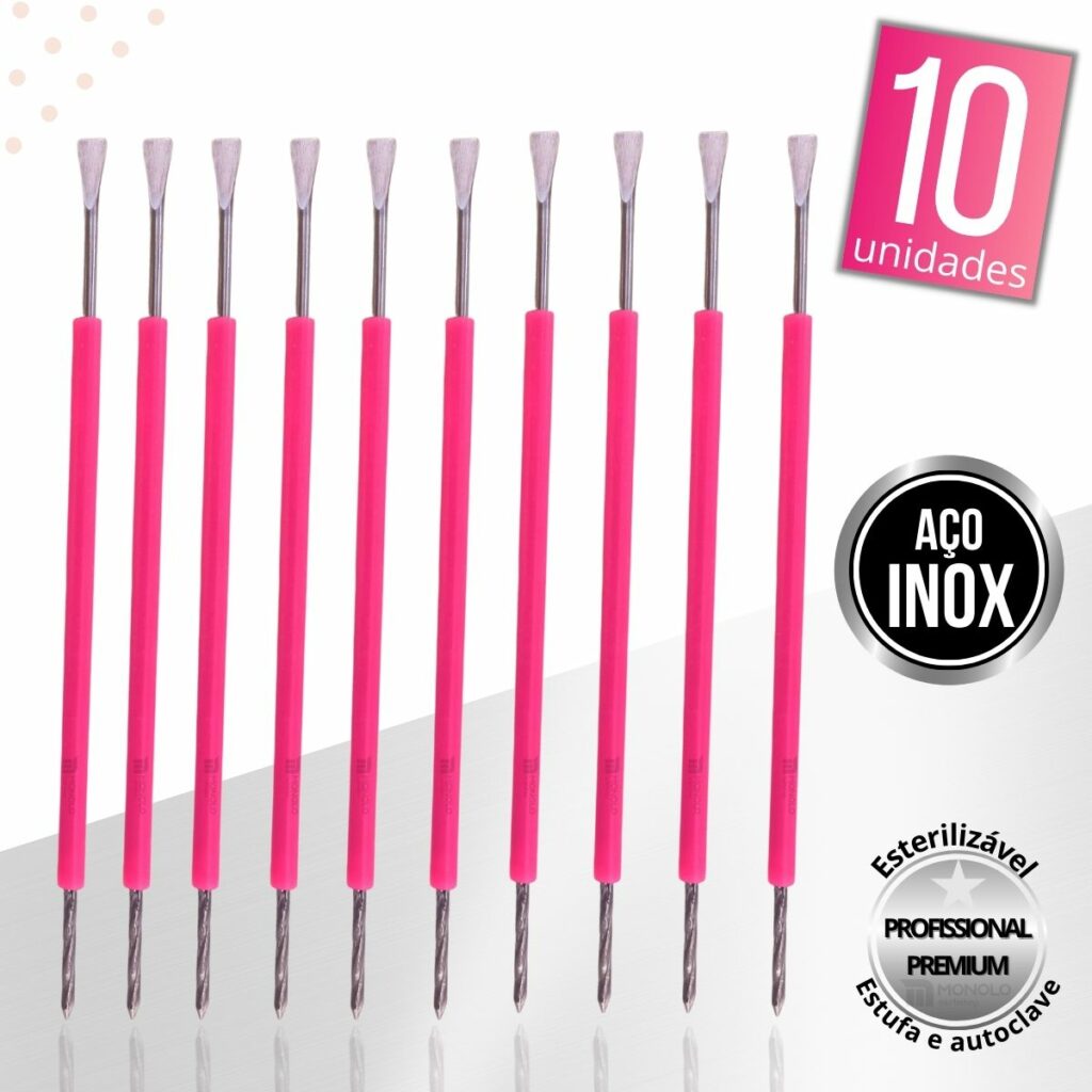 Kit 10 Espátula Mista Empurrador Curvo Palito Silicone Cutícula Manicure Cutelaria Aço Inox Monolo