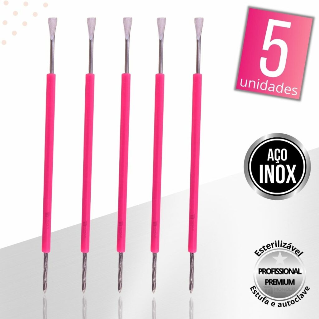 Kit 5 Espátula Mista Empurrador Curvo Palito Silicone Cutícula Manicure Cutelaria Aço Inox Monolo