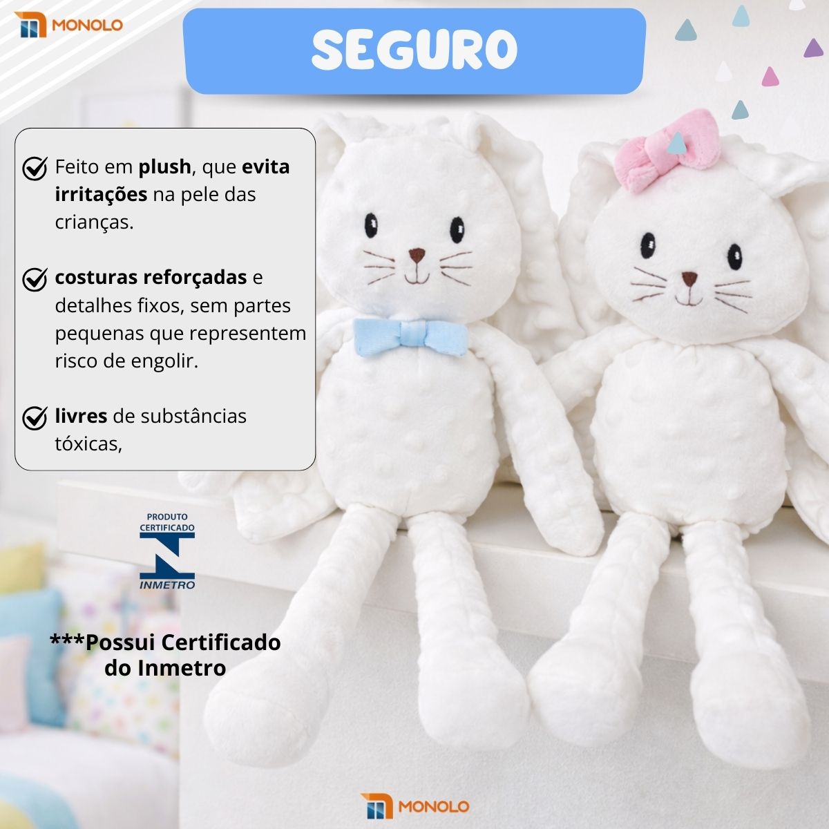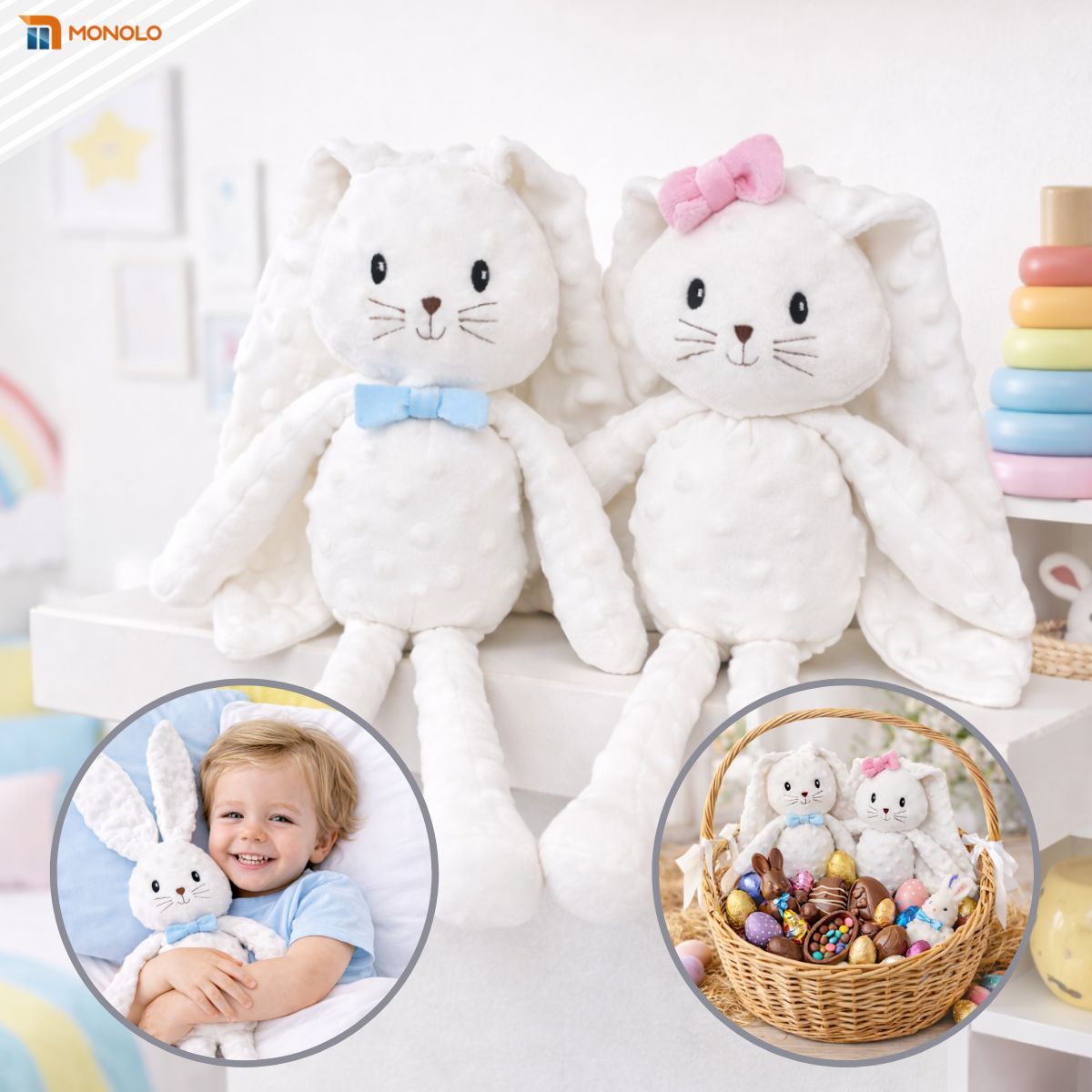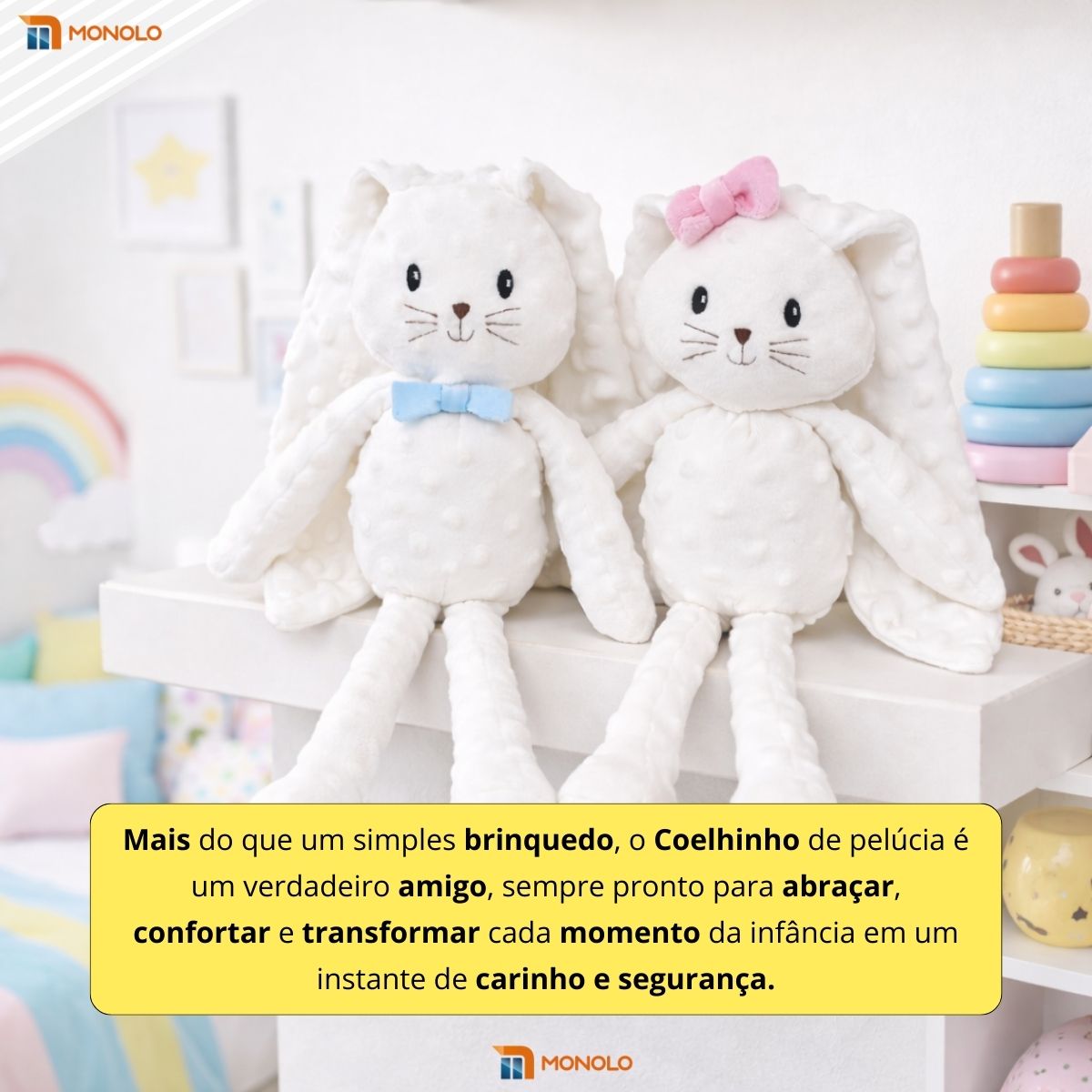 Encante crianças e adultos com estes coelhinhos de pelúcia irresistivelmente macios, criados para transmitir carinho, conforto e aconchego em cada detalhe. Confeccionados em tecido texturizado super suave, com acabamento delicado, rostinho bordado e laços charmosos em azul e rosa, eles são ideais não apenas para presentear e decorar quartos infantis, mas também para compor vitrines, decorar lojas, montar cestas de Páscoa e criar ambientes temáticos encantadores, agregando valor visual e emocional ao seu espaço ou presente.