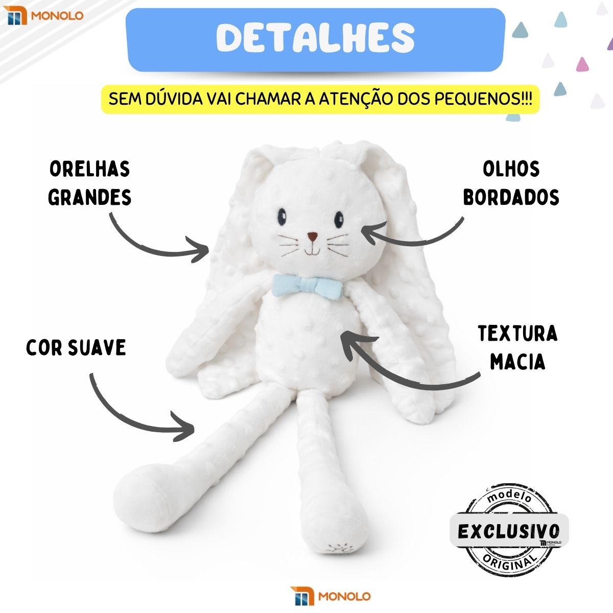 · Orelhas longas e flexíveis, estimulam o toque e a interação sensorial