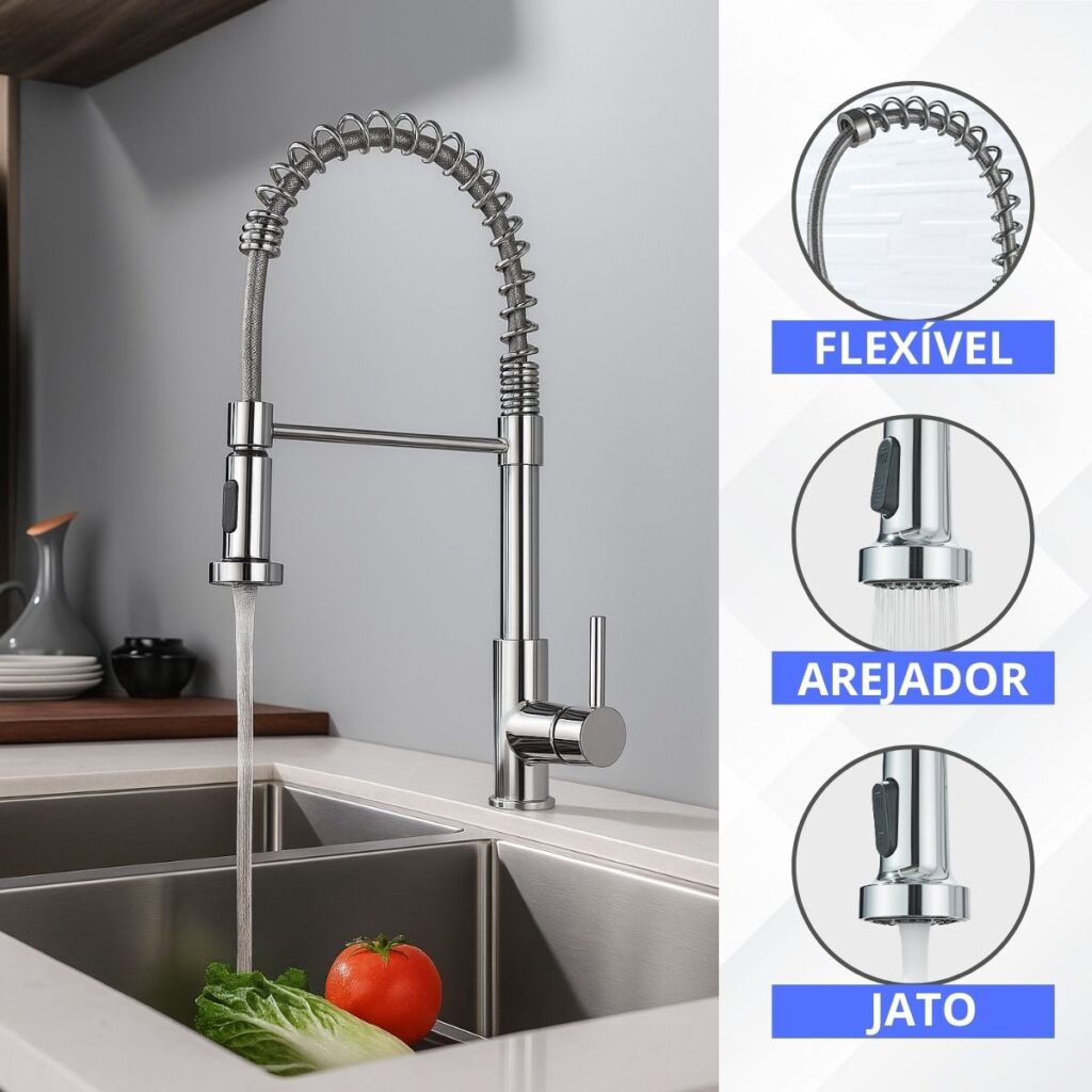 Torneira Cozinha Bancada Gourmet Cromado Flexível Inox Mola Design Moderno Fácil Instalação Luxo